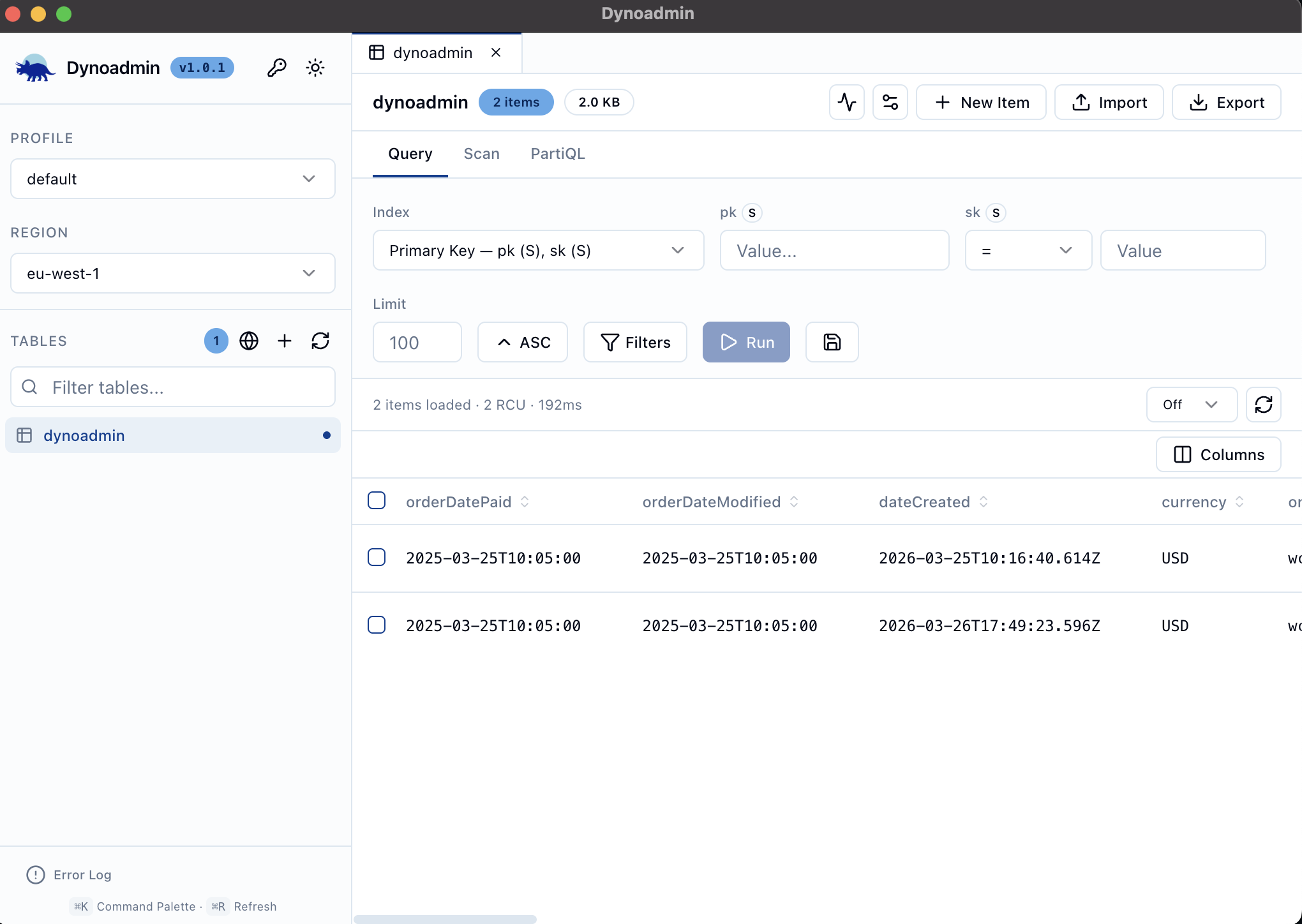 A fast desktop GUI for Amazon DynamoDB. Query with PartiQL, edit items as JSON, switch accounts and regions instantly — similar to what you know from tools like Dynobase, tuned for speed and clarity.